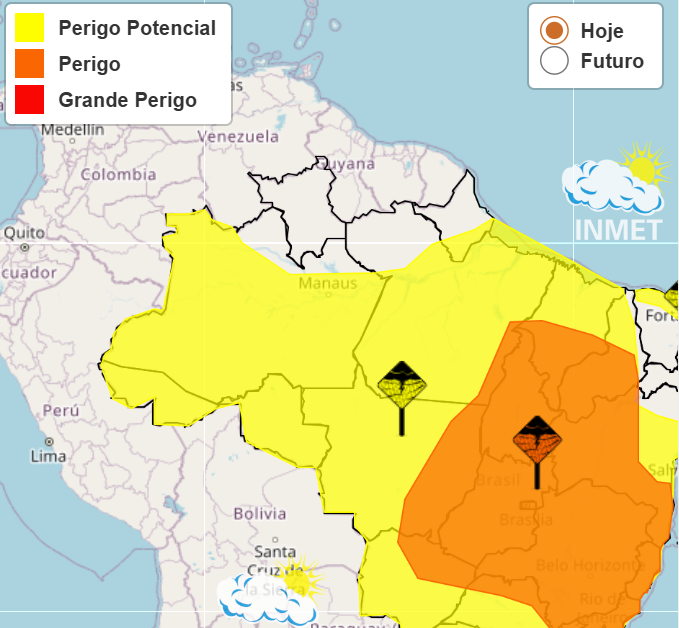 Também está em vigor alerta de perigo para chuvas intensas, indicando precipitações entre 30 e 60 mm por hora ou até 100 mm por dia, acompanhadas de ventos que podem variar de 60 a 100 km/h. Nesse caso, o risco é maior, com possibilidade de cortes no fornecimento de energia elétrica, queda de árvores, alagamentos e descargas elétricas. O aviso contempla áreas como Centro Goiano, Oeste de Minas, Metropolitana de Belo Horizonte, Metropolitana do Rio de Janeiro, Norte de Minas, Distrito Federal, além de regiões do Amazonas, Maranhão, Piauí, Bahia e Mato Grosso.