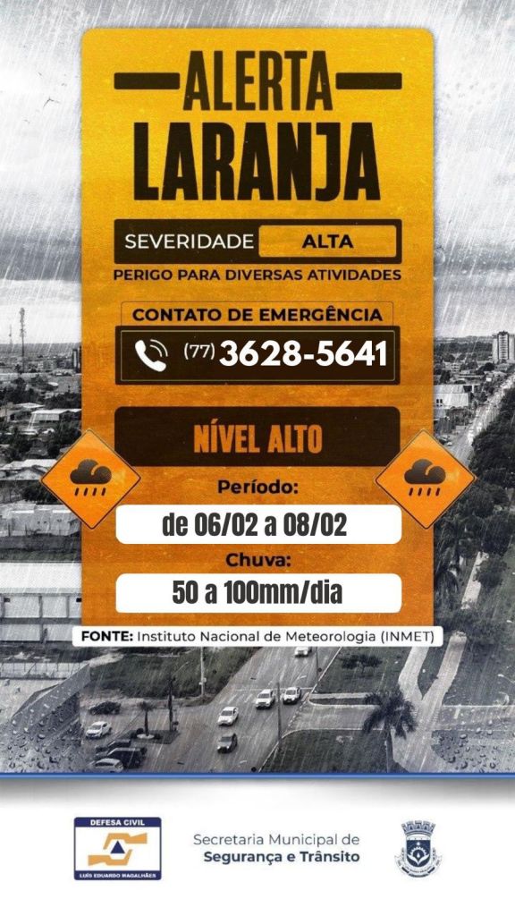 A região Oeste segue em alerta amarelo para chuvas intensas até sábado (07/02). Em caso de urgência, entre em contato com a Defesa Civil Municipal pelo telefone (77) 3628-5641 ou com o Corpo de Bombeiros Militar pelo número (77) 99926-5586.