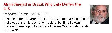 A revista Times publicou neste dia 25 uma matéria com mais de 800 palavras sobre o encontro do líder iraniano com o presidente Lula. Como se pode notar pelo texto, os americanos esperam que o Brasil não estabeleça laços estratégicos com o Iran, principalmente no que diz respeito ao enriquecimento de urânio, o nó górdio da questão: