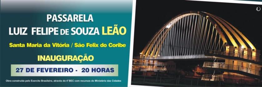 O Governo do Estado estará anunciando, depois do carnaval, em toda a região, através de grandes cartazes, a inauguração da passarela sobre o rio Corrente, entre  Coribe – Santa Maria da Vitória. O projeto da obra é de Davi Frank e foi feito sem ônus, a pedido do então deputado João Leão. A cerimônia está marcada para dia 27, às 20 horas.