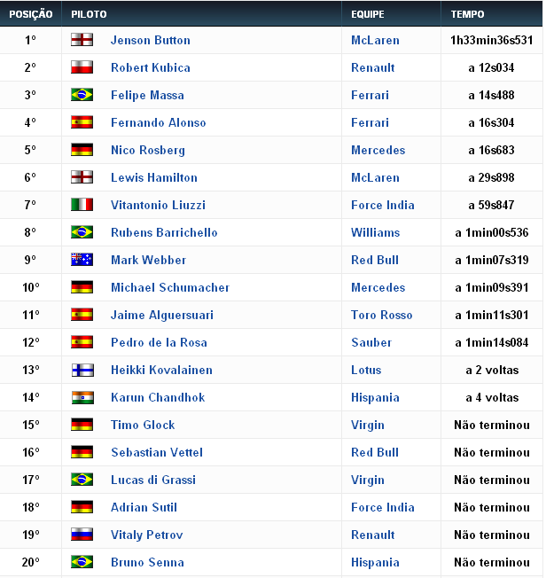 A primeira parte da prova foi liderada por Sebastien Vettel, mostrando que o carro da Red Bull Racing ( ou RBR, como diz a Globo) é mesmo muito superior. Mas Vettel rodou, num cochilo ou com problema nos freios, e Jenson Button, que logo após o fim da chuva fez, por decisão sua, uma troca precoce de pneus, assumiu a liderança, mostrando que Hamilton não vai ter vida fácil na McLaren. Button é conservador ao pilotar e sabe tocar o carro com vistas ao resultado. Não foi por outro motivo, que se tornou campeão no ano passado.
