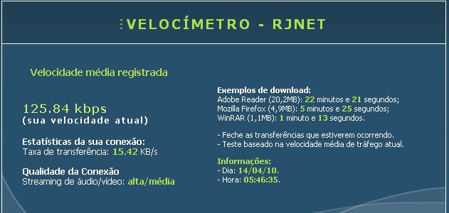 A Operadora de celulares VIVO sofreu ontem um novo apagão, com emudecimento absoluto dos telefones móveis e da rede de internet 3G. Olha só a nossa hiper-mega-turbo velocidade às 5h46m da madrugada de hoje. Assim o Editor terá que fazer um MBA de morcego, trabalhando só nas horas mortas.