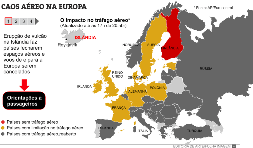 A regularização do transporte aéreo e da demanda reprimida na Europa ainda deve levar semanas. Arte e informações da Folha de São Paulo.