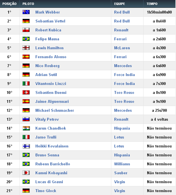 Com o abandono, o piloto da Mc Laren perdeu a liderança do Mundial e ainda caiu para a quarta colocação. Button tem 70 pontos, contra 78 do vencedor da corrida, Mark Webber e de Sebastian Vettel, ambos da Red Bull. Fernando Alonso, da Ferrari é o terceiro com 75.