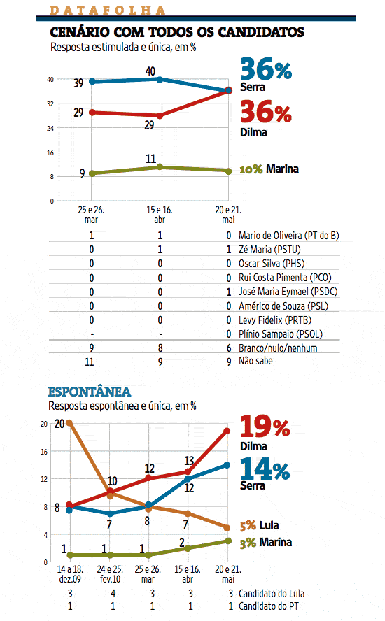 Em tese, portanto, o potencial de voto espontâneo em Dilma pode ser de 28% – os seus 19% e mais outros 9% dos que desejam votar em Lula, em quem ele indicar ou em um nome apresentado pelo PT. Informações e arte da Folha de São Paulo que circula, neste domingo, com novo formato gráfico e editorial.