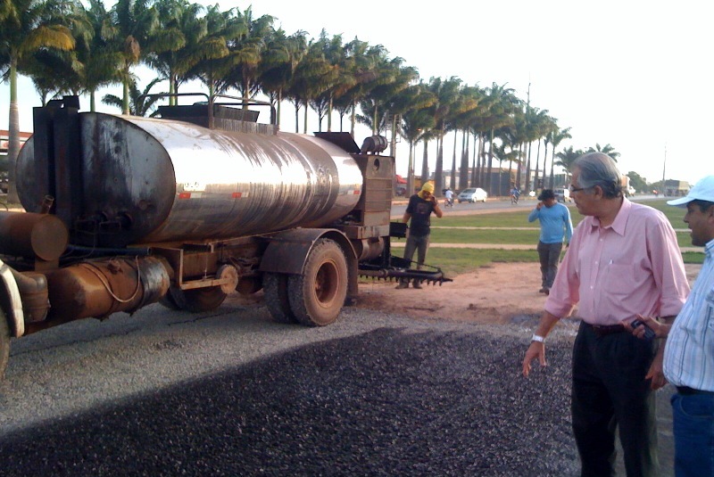 O prefeito Humberto Santa Cruz foi assistir pessoalmente o trabalho de asfaltamento dos estacionamentos da praça Luís Eduardo Magalhães em frente ao Centro Administrativo Municipal. Com a conclusão dessa etapa, fica praticamente pronta a praça, faltando apenas o resto da arborização. Foto de Sauro Thielle.