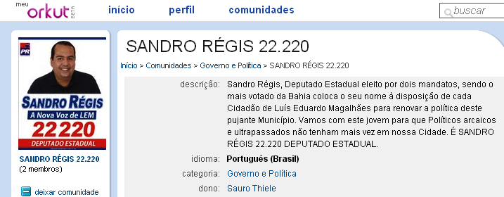 O marqueteiro Sauro Thiele, da Thiele Consultoria, já deu o tiro inicial da campanha à reeleição do deputado Sandro Régis à Assembléia Legislativa da Bahia. Sandro Régis é o deputado mais votado da Assembléia nas duas últimas campanhas, o que facilita a campanha de Sauro. Sandro tem se dedicado aos interesses de Luís Eduardo, com indicações da criação do Corpo de Bombeiros, da companhia independente de Polícia Militar, do novo centro de segurança da cidade e, principalmente, da criação da Secretaria Extraordinária dos Negócios do Oeste, com o objetivo de descentralizar as decisões de Salvador. Sauro está usando até o Orkut na campanha e promete a criação de uma comunidade dedicada a Sandro Régis.
