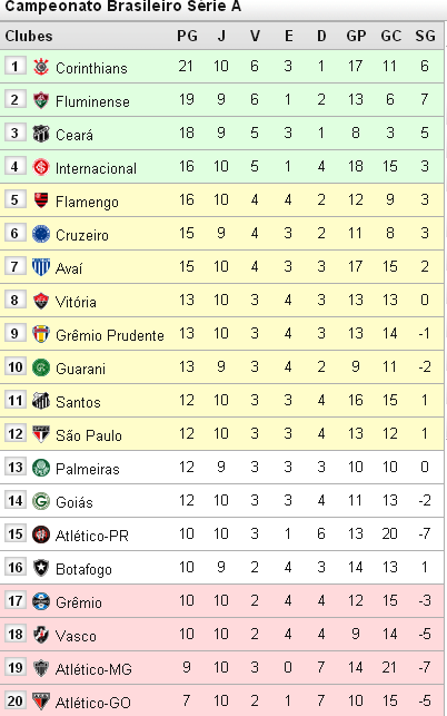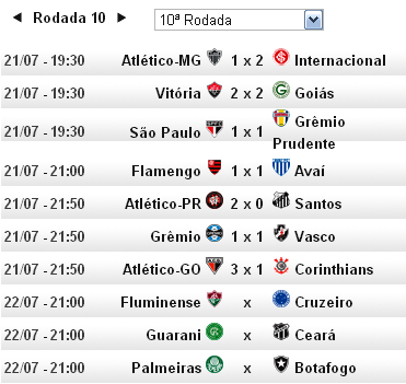 Apesar de ter sofrido um gol aos 7 minutos, os torcedores atleticanos viram o Internacional virar em cima de seu time, no Estádio Jacaré, em Sete Lagoas. Lagoa mesmo se transformou o estádio Olímpico, com pesadas chuvas antes e durante o jogo, em que o Grêmio empatou sofrivelmente com o Vasco, permanecendo os dois na zona de rebaixamento. Provavelmente o pior jogo até aqui no campeonato, tão ruim como a novela que o precedeu. O Santos perdeu novamente, com os meninos da Vila todos de salto alto. O Vitória da Bahia arrancou um empate depois de estar perdendo por 2X0. No final do jogo, a briga entre o treinador Leão, que mostrou suas garras para um radialista, acabou na Delegacia de Polícia. Veja os resultados da 10º rodada, os jogos de hoje e a classificação provisória do brasileirão.