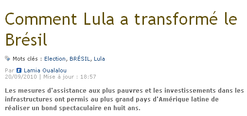 O jornal francês Le Figaro publicou ontem uma matéria laudatória sobre as transformações que o presidente Lula operou no Brasil. Sinal que após as eleições sai a compra dos aviões do Projeto FX-2 da FAB. Se rouba muito neste País e os franceses querem por a mão nesse pirão.
