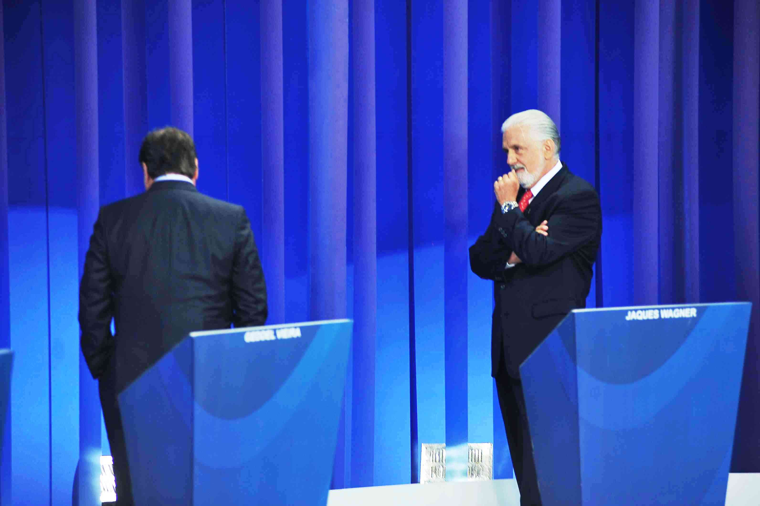Deixo por conta do leitor a melhor legenda para a foto, que mostra Jaques Wagner e Geddel Vieira Lima durante o debate da TV Aratu. Dizem que aconteceram palavras ásperas entre os dois candidatos nos corredores da emissora. Baseado nisso, me atrevo, a fazer uma legenda. Wagner parece estar dizendo: “Mas que belo fdp me saiu esse baixinho!” Se não disse, pensou. Pensou, Governador?