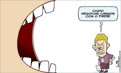 Diz o senador Aloísio Mercadante que na Esplanada dos Ministérios acontece uma grande e coletiva TPM: Tensão Pré-Ministerial. PMDB, PT, PP e outros da base aliada vão disputar até a posse de clips nos ensolarados prédios da esplanada. São 37 ministérios, dezenas de empresas estatais e mais de 100 mil cargos de confiança. Disputados no tapa, na bolsada, cuspida, mordida e arranhão. Charge de Lute, publicada no jornal Hoje em Dia.