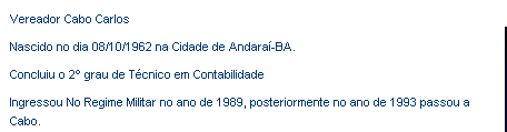Uma assessora do vereador Cabo Carlos, muito educada, ligou hoje pela manhã, lamentando que tenhamos colocado a idade do Vereador como a de 48 anos. Está errado realmente. O valente Cabo Carlos tem na verdade 43 anos. No entanto, fomos induzidos ao erro: o site da Câmara, onde pesquisamos o perfil do Vereador indica seu nascimento na data de 08/10/1962. Portanto, teria completado em outubro recente 48 anos. Retificado nosso erro, pedimos também a retificação do site da Câmara.