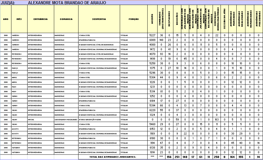 Uma demonstração clara que a Comarca de Luís Eduardo Magalhães necessita de juízes com dedicação exclusiva está na página do Tribunal de Justiça, que relata a produtividade dos drs. Alexandre Brandão e Claudemir da Silva Pereira. Dada a enormidade de processos distribuídos para os dois magistrados, em suas comarcas de origem, Barreiras e Formosa do Rio Preto, até o leigo chega a conclusão de que é impossível atender a tanto trabalho. Clique nas imagens para ampliá-las e se ainda a resolução das tabelas não for a ideal, clique no link do Tribunal e na aba Produtividade/ Juízes de 1º Grau.
