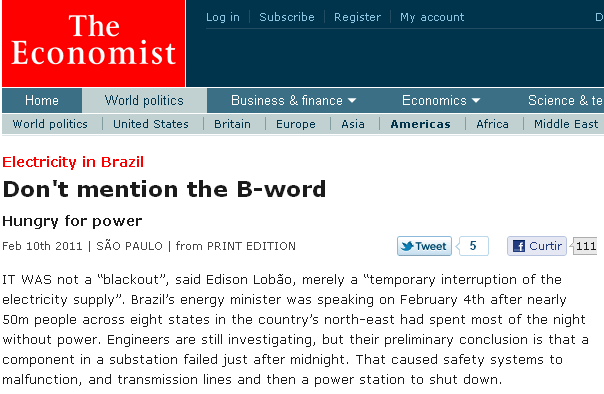 Em avaliação feita sobre a questão da energia elétrica no Brasil, a revista britânica Economist conclui em reportagem que o “blackout” é apenas a expressão de um problema ainda sem solução. De acordo com a revista, os brasileiros terão que se “acostumar com as ‘interrupções temporárias’ de energia toda vez que ligarem seus aparelhos de ar condicionado”. O artigo faz ainda ironia com o ministro de Minas e Energia, Edison Lobão, afirmando que, para ele, a palavra “apagão” (“blackout”, no original), está proibida. Ele prefere se referir ao caso como “interrupção temporária de energia”.