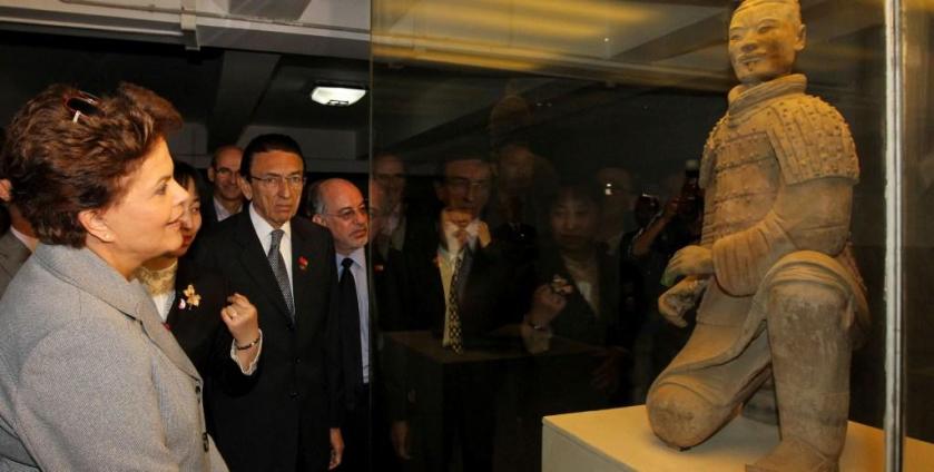 A presidente Dilma Rousseff antes de embarcar de volta ao Brasil foi visitar os guerreiros de terracota, uma das maiores heranças culturais de todo o mundo. É preciso que os leitores não confundam o cavalheiro que aparece em segundo plano como um dos guerreiros. Trata-se apenas de um grande lobo com os cabelos pintados.