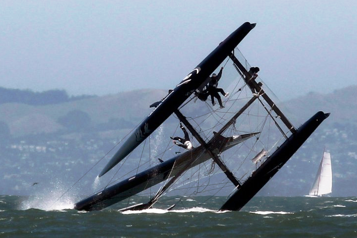 Foto de Beck Diefenbach da agência Reuters. No dia 13, os marinheiros do catamaran Racing Oracle AC45 são jogados longe do barco quando este capotou na competição realizada na bahia de São Francisco. Os tripulantes não foram feridos. “Apenas os egos estão machucados”, disse um deles em tom de brincadeira.