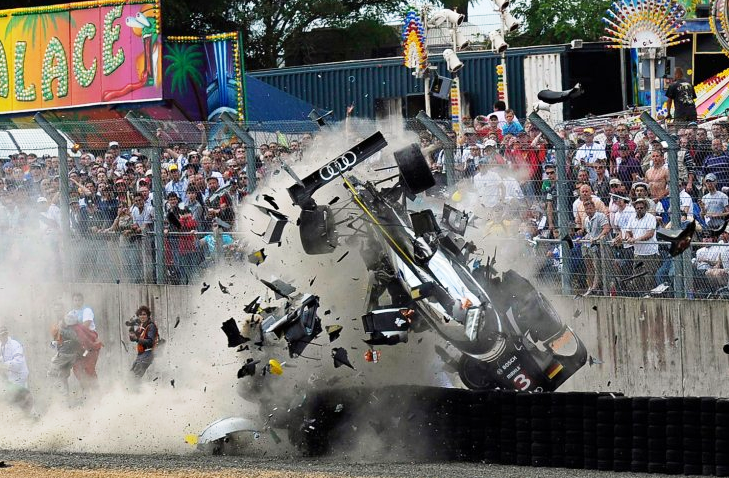Foto de Denis Lambert – MaxPPP / EPA – para a Time. No sábado passado, 11, o piloto escocês Allan McNish sai da pista em Audi R18, depois de capotar 3 vezes durante a competição das 24 horas de Le Mans. Sua equipe ganhou a prova com apenas um carro, competindo até o fim contra três carros da Peugeot.