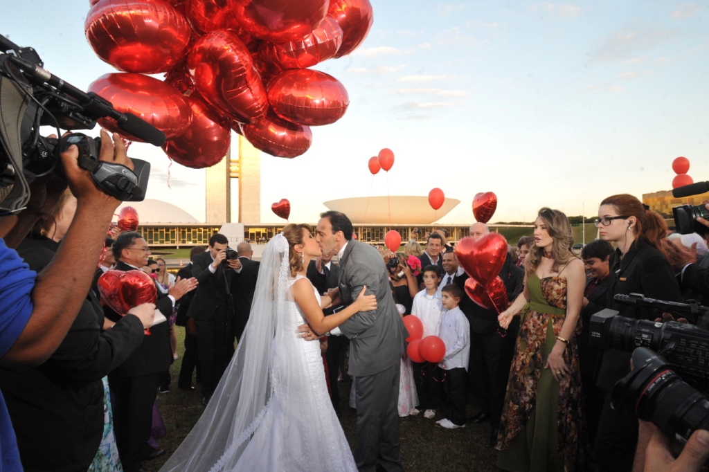 O advogado Jackson Domênico e a cantora gospel Nádia Santolli realizam sonho de se casar em frente ao Congresso Nacional. Os noivos conquistaram a simpatia da mídia e foram os mais fotografados do dia. Foto de Elza Fiuza, a menor grande fotógrafa da Agência BR.
