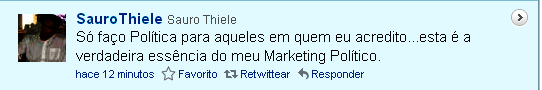 Sauro Thiele, articulador político e homem de marketing, está fazendo aniversário hoje. E completando 18 anos como legionário do Democratas. Como todo bom carlista, deixou no twitter sua profissão de fé no carlismo e nas oposições brasileiras.
