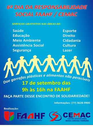 A FAAHF (Faculdade Arnaldo Horácio Ferreira) e o CEMAC (Centro Educacional Maria Cardoso Ferreira) realizam no dia 17 de setembro o 6º Dia da Responsabilidade Social. O evento acontece das 9h às 16h e oferece à comunidade serviços gratuitos nas áreas de Saúde, Educação, Meio Ambiente, Assistência Social, Segurança, Esporte, Direito, Cidadania, Cultura e Lazer.