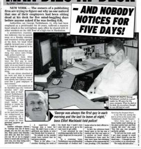 Os gerentes de uma Editora novaiorquina estão tentando descobrir, porque ninguém notou que um dos seus empregados estava morto, sentado à sua mesa há cinco dias. George Turklebaum, 51 anos, que trabalhava como Verificador de Texto numa firma de Nova Iorque há 30 anos, sofreu um ataque cardíaco no andar onde trabalhava (open space, sem divisórias) com outros 23 funcionários.