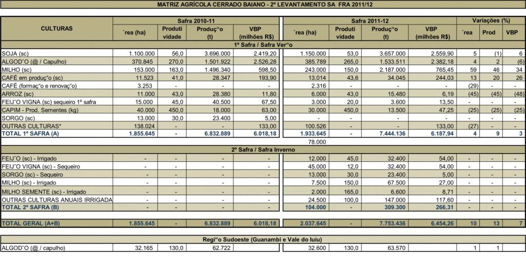 O milho foi a cultura que mais cresceu em área, de acordo com o 2° Levantamento da Safra 2011/12. Foram 59% a mais que no ciclo anterior. A participação da commodity na matriz produtiva da região ficará em 12% da área, percentual ainda abaixo da recomendação técnica para a rotação de culturas, que varia de 25% a 33%. O mercado determinou o aumento da área plantada. Os preços do milho, que amargaram depreciação durante muitos anos, tiveram uma sensível melhora no último ano. No pior momento, entre novembro/dezembro de 2009, chegaram a R$13,25, a saca de 60 quilos. Já no mesmo período em 2011, registraram R$24,50 e se mantêm neste patamar. O cerrado baiano deverá produzir em torno de 2,2 milhões de toneladas de milho, 46% a mais que na safra passada, com produtividade de 150 sacas por hectare.