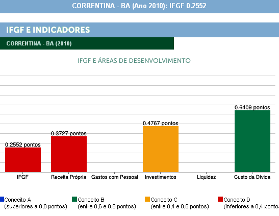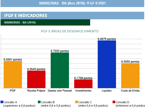 Apesar de 2010 ter sido o ano de maior crescimento econômico do país desde 1986, o IFGF aponta que os municípios brasileiros estão, em média, em uma situação fiscal difícil. O índice Brasil atingiu 0,5321 pontos, influenciado pelo crítico desempenho do indicador de Receita Própria (0,2414 pontos), além da difícil situação retratada pelo IFGF Liquidez (0,5719) e pelo IFGF Gasto com Pessoal (0,5773). Por outro lado, o IFGF Investimentos atingiu seu maior nível desde 2006 (0,6163 pontos), enquanto o IFGF Custo da Dívida manteve a melhor pontuação entre os cinco indicadores avaliados pelo estudo (0,8055 pontos).