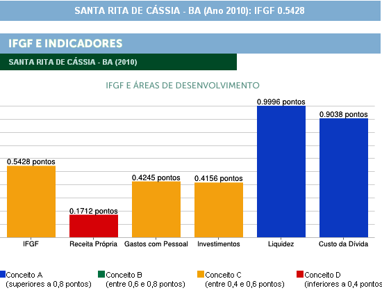 O índice varia entre 0 e 1, quanto maior, melhor é a gestão fiscal do município. Cada município é classificado com conceitos A (Gestão de Excelência, acima de 0,8001 pontos), B (Boa Gestão, entre 0,6001 e 0,8), C (Gestão em Dificuldade, entre 0,4001 e 0,6) ou D (Gestão Crítica, inferiores a 0,4 pontos).