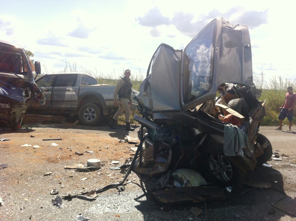 Uma colisão entre um micro-ônibus e Volkswagen Gol, nas proximidades do povoado Novo Paraná, na BR-020, causou três mortes na tarde de hoje.Segundo testemunhas oculares, o motorista do carro, Vitalino Belmiro de Lima, e mais dois passageiros sofreram morte instantânea devido a violência do choque, que envolveu também uma camionete L-200. A SAMU de Luís Eduardo e a Polícia Federal atenderam o acidente. A foto é do cardiologista Cleber Winkler.