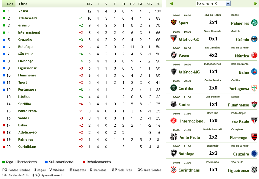 Quem está fazendo festa são os gremistas, que após vencerem o último colocado na tabela, o Corinthians, passaram à frente do Internacional. Este só conseguiu um empate com o Fluminense. O Bahia perdeu para o líder Vasco e está na zona de desclassificação.Veja os resultados e a classificação na tabela criada pela Tabela Fácil para o jornal Lance e Lancenet. Clique na imagem para ampliar.