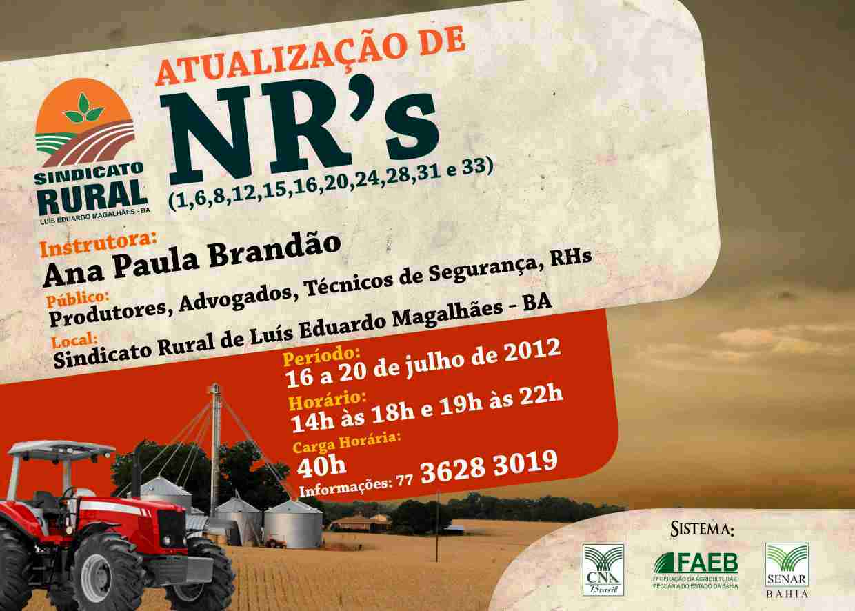 O Sindicato Rural realizará treinamento direcionado à prevencionistas na área rural como produtores rurais, técnicos e engenheiros de Segurança, advogados, contadores, gestores, Rh´s, estudantes e profissionais de áreas afins, esclarecendo e enfatizando as atualizações das normas cobradas pelo Ministério do Trabalho e outros órgãos na empresa rural. Carga Horária: 40 hs. Educadora: Ana Paula Brandão. A taxa de inscrição é de R$420,00 até dia 10/07 e, após esta data, R$460,00. Inscrições até dia 13/07/2012.