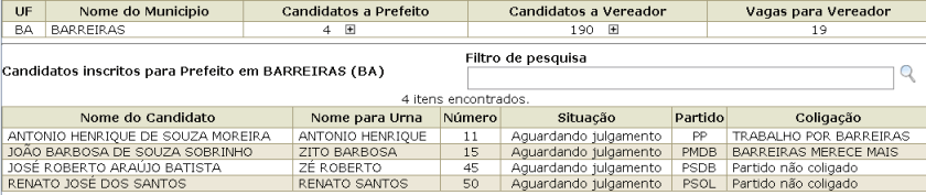 Os nomes de Jusmari Oliveira e de sua vice Kelly Magalhães ainda não constam na lista de candidatos a Prefeito em Barreiras.