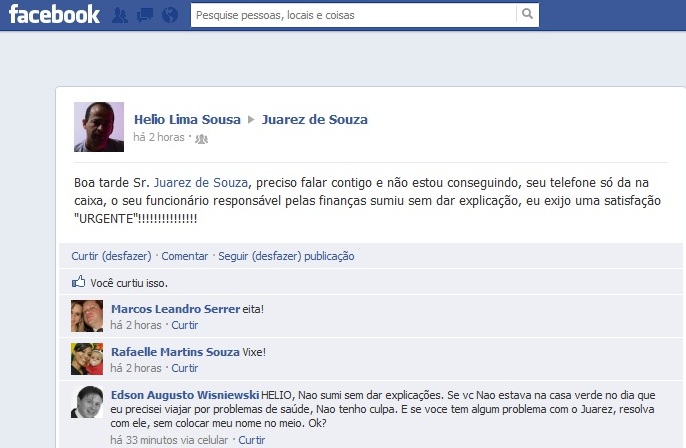 Pelo jeito, todo mundo já se entendeu, porque a mensagem agreste foi retirada do facebook. Nem por isso a gente deixa de publicar. Se a moda pega, vai ter muita gente cobrando suas dívidas pelo FACE.