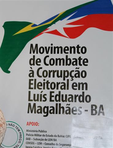 O Movimento de Combate à Corrupção Eleitoral aconteceu hoje pela manhã, no Hotel Paranoá e foi organizado pelo Ministério Público Eleitoral, OAB, Polícia Militar do Estado da Bahia, CONSEG-LEM, Igreja Católica, Amelem (Associação dos Ministros Evangélicos de Luís Eduardo Magalhães), Lojas Maçônicas, Acelem, Rotary e Lions.