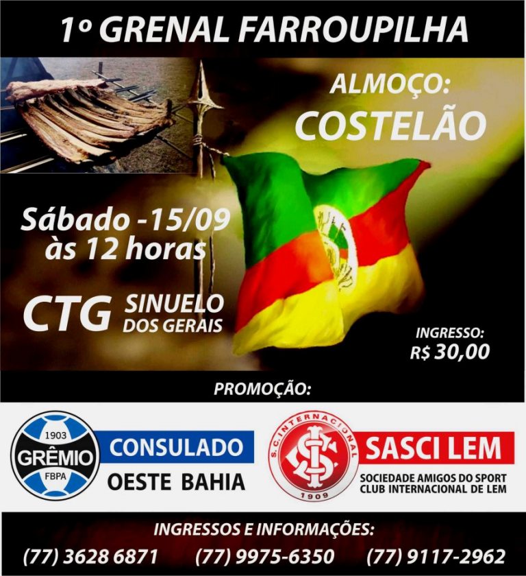 Gremistas e colorados se uniram para realizar, neste sábado, às 12 horas, no CTG Sinuelo dos Gerais, o 1º Grenal Farroupilha, abrindo a semana de comemorações da data magna do Rio Grande do Sul. No cardápio, costelão com acompanhamentos e muita música gaúcha. Ingressos limitados, somente com venda antecipada.