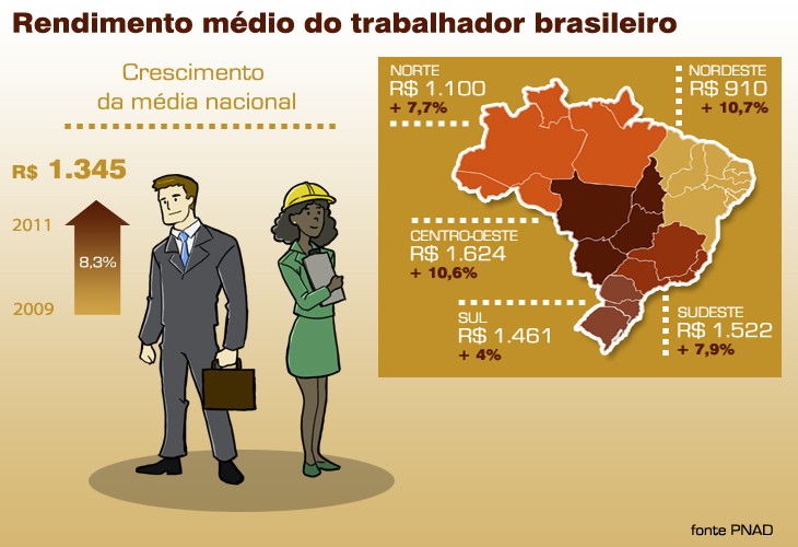 Segundo dados da Pesquisa Nacional por Amostra de Domicílios 2011 (Pnad), divulgada pelo IBGE, o rendimento médio mensal real do trabalhador brasileiro cresceu 8,3% entre 2009 e 2011. O valor chegou a R$ 1.345. Os maiores aumentos foram registrados nas regiões Nordeste (10,7%) e Centro-Oeste (10,6%), que concentra o maior valor do país: R$ 1.624