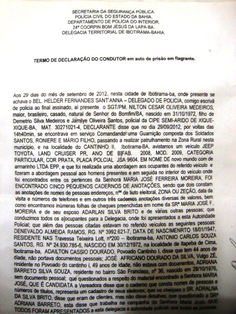 A Justiça Eleitoral de Ibotirama terá um dos casos mais complicados, em todo o Oeste baiano, para resolver até a diplomação dos eleitos. Acontece que a candidata mais votada do Município, Maria José Ferreira Moreira, a Zeza, que obteve 1.344 votos (9,22% dos votos válidos) foi conduzida, antes das eleições (29/09), pela Polícia Militar, à presença do delegado Helder Fernandes Santana, por portar cinco cadernos com anotações de nomes, número do título de eleitor e anotações de supostos pagamentos por obtenção ilegal de sufrágio eleitoral.
