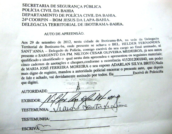 Veja a seguir fac símile dos documentos da apreensão e do termo de ocorrência lavrado na Delegacia: