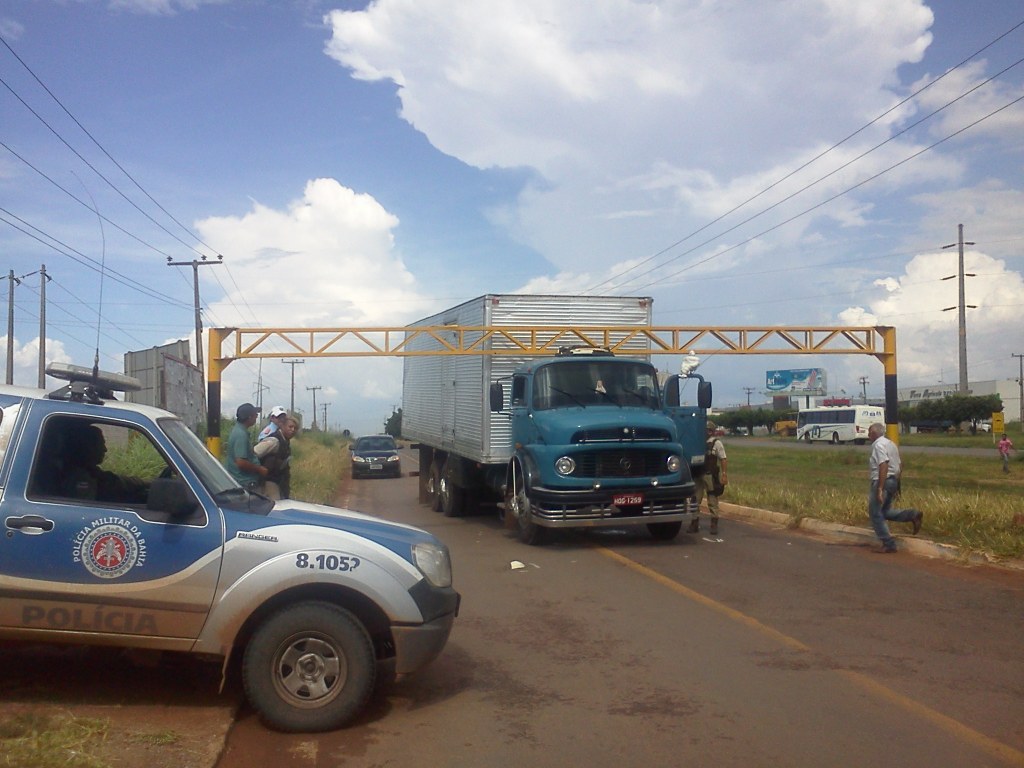 O motorista de uma caminhão de Anápolis, Goiás, ou estava muito distraído ou tinha tomado uma overdose de pequi: entrou na via lateral da BR 242, hoje à tarde, e só parou quando a barreira bateu na janela de ventilação da cabine.