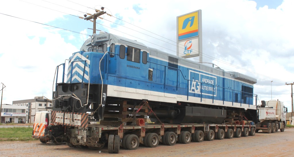 Está passando por Luís Eduardo o transporte especial que levará até Brumado a primeira de três locomotivas que a Andrade Gutierrez usará no assentamento dos trilhos, no trecho de sua responsabilidade, na Ferrovia Oeste-Leste. Doze eixos e 48 rodas sustentam o tandem que carrega a locomotiva. Esta foi transportada sem o material rodante.