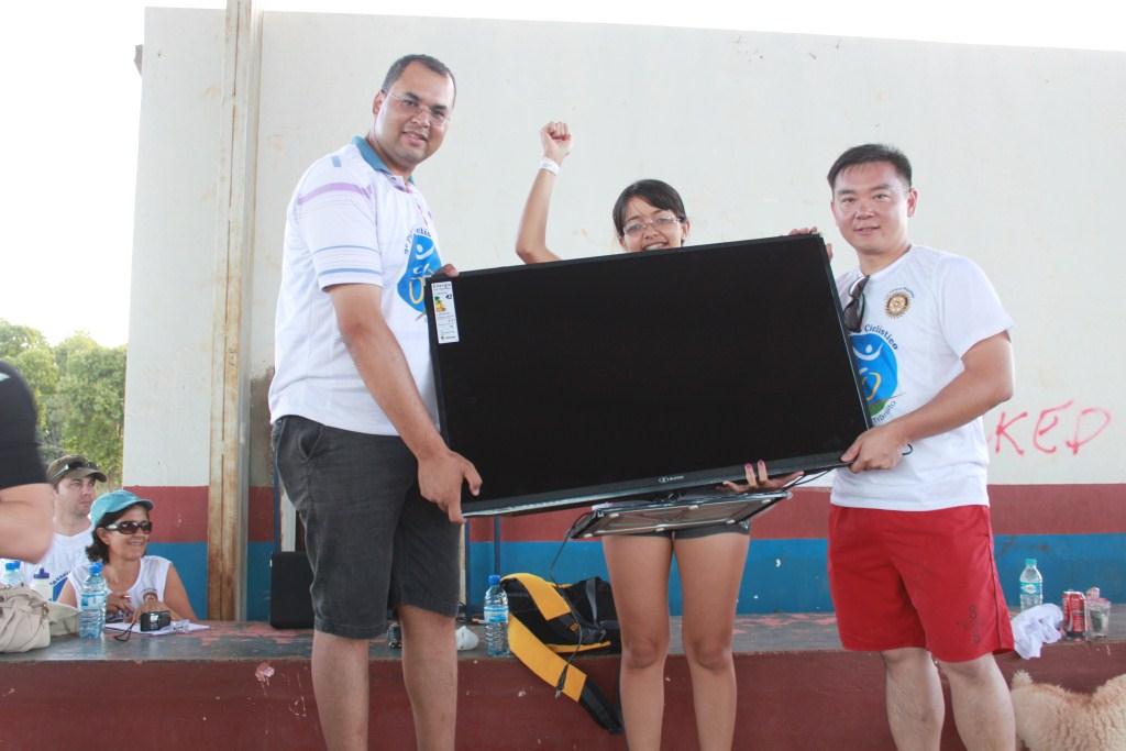A ganhadora da TV quase some atrás do aparelho de 42"