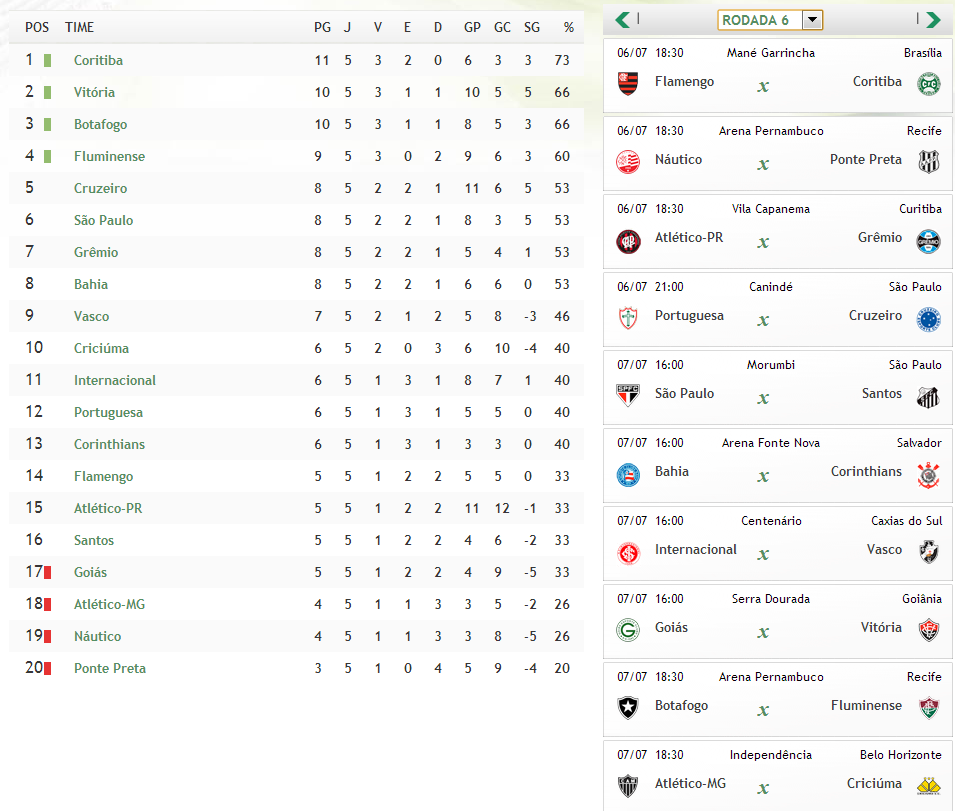 Ainda lembra quem é o líder do campeonato brasileiro de futebol? Pois é, Coritiba, líder isolado, com 11 pontos. E o baiano Vitória está em segundo, doido para assumir a liderança. Neste final de semana, recomeça o campeonato e, em vez daqueles passes para os lados dos espanhóis, vamos ver muito chutão pra frente e muita canela quebrada. As tabelas são do Lancenet.