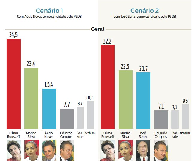 Dilma está à frente nos dois cenários que hoje são mais prováveis, com porcentuais de intenção de voto variando de 32,2% a 34,5%. Além de Marina Silva (Rede), que aparece em segundo nos dois cenários, o ex-governador de São Paulo José Serra (PSDB) teve um bom desempenho. Ele está tecnicamente empatado com Marina numa das simulações e teoricamente teria chance de ir para o segundo turno com Dilma. O PSDB trabalha para lançar Aécio Neves (MG), que teve desempenho pior que o de Serra. Mas isso não coloca Serra fora da disputa. O paulista avalia a possibilidade de se filiar a outro partido para concorrer.