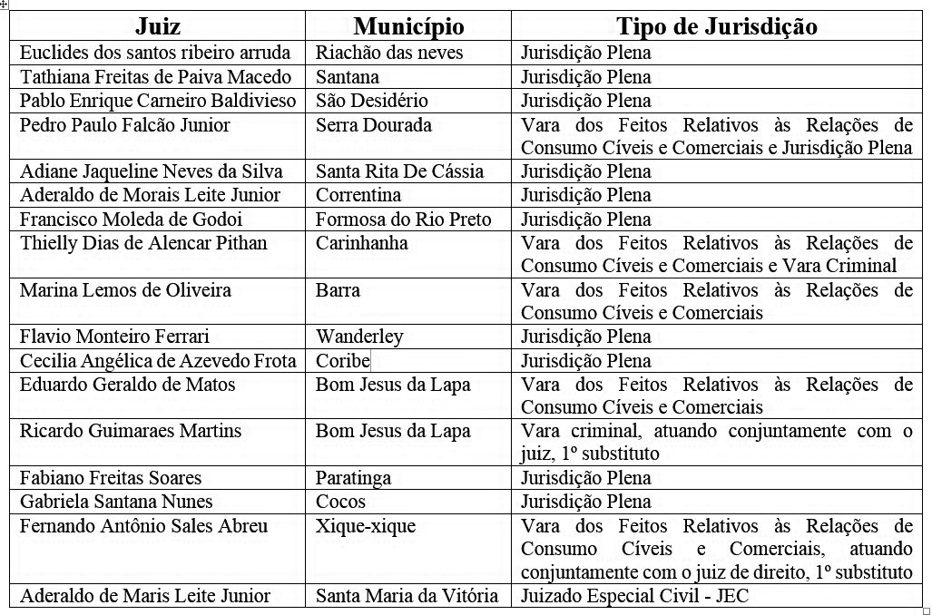 Segundo a publicação, os magistrados iniciam suas atividades a partir de 29/10/2013 e até ulterior deliberação. Para o oeste baiano e adjacências, foram designados 17 juízes que responderam por 16 comarcas. Desse total, 11 são Jurisdições Plenas, 4 Varas dos Feitos Relativos às Relações de Consumo Cíveis e Comerciais, 1 Vara Criminal e 1 Juizado Especial, como segue tabela a baixo: