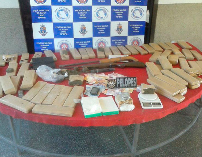 A Polícia Militar de Barreiras apreendeu hoje grande quantidade de droga no morro do Salsicha. Foram apreendidos 60 tabletes de maconha (50Kg), 3 Kg de cocaína, 500 gramas de crack, 02 balanças de precisão, 12 armas de fabricação caseira, uma espingarda 5.5, R$ 834,00 e um veiculo Celta. Foto do Oeste Mania, editada.