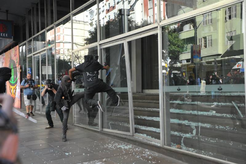 Assim não dá: em Porto Alegre, enquanto dois black blocks destroem a fachada de um prédio, outros dois fotografam. Eles dão mais importância às mídias sociais que à sua ação de destruição.