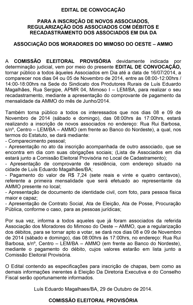 Edital de Convocação da Associação dos Moradores do Mimoso do Oeste