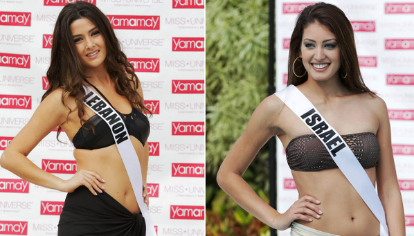 O concurso de Miss Universo, realizado em Miami, adquiriu tintas quase diplomáticas depois que, neste domingo, a Miss Israel publicou um “selfie” de Miss Líbano no Instagran. Sale Greige, do Líbano, diz que tem tido cuidado para não falar e não sair em fotos ao lado da Miss Israel. Mas foi traída pela “brima”, que fotografou-a em um grupo. A intolerância não tem realmente limites. A foto acima é do New York Times. As páginas do Facebook das duas beldades podem ser acessadas aqui e aqui.