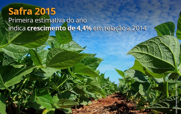 A primeira estimativa de 2015 para a safra nacional de cereais, leguminosas e oleaginosas (caroço de algodão, amendoim, arroz, feijão, mamona, milho, soja, aveia, centeio, cevada, girassol, sorgo, trigo e triticale) totalizou 201,3 milhões de toneladas, um crescimento de 4,4% em relação à obtida em 2014, que somou 192,8 milhões de toneladas.