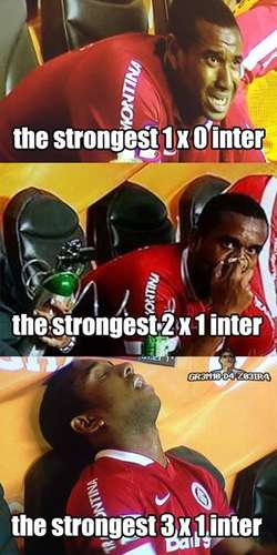 Mesmo reconhecendo as condições, a turma da corneta saiu em campo na internet, criando memes como este para gozar a derrota colorada.
